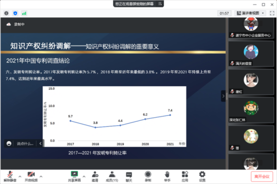 中小企业知识产权侵权纠纷处理及援助培训会为进一步提升企业知识产权管理水平,强化企业知识产权保护意识,提升工作人员的知识产权保护和维权技巧,服务中心于12月23日举办了知识产权侵权纠纷处理及援助线上培训会,共有15家专精特新企业通过腾讯会议app参加本次培训。